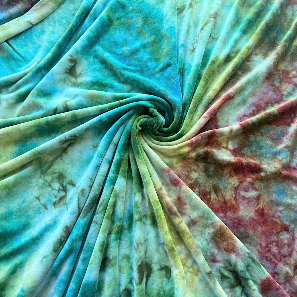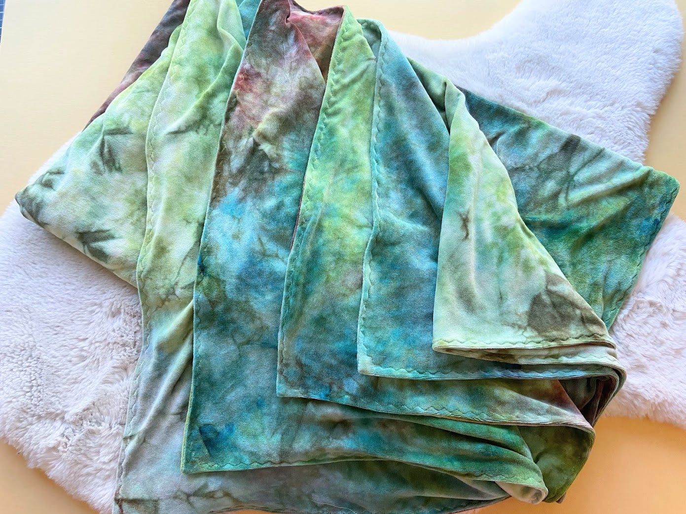 Entire blanket handmade in bamboo velour (70% viscose bamboo, 28% organic cotton, 2% polyester). It has been hand dyed LWI (low water immersion) style. This style of dyeing results in beautiful, random color patterns as the dyes mix and mingle into new colors, making each piece beautifully unique.