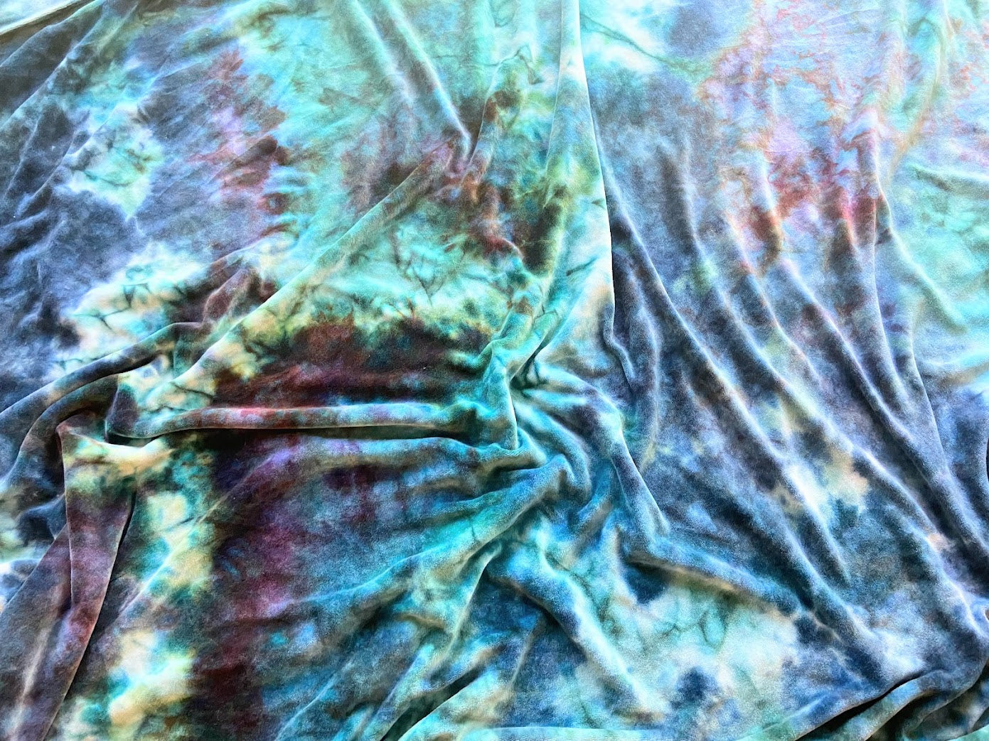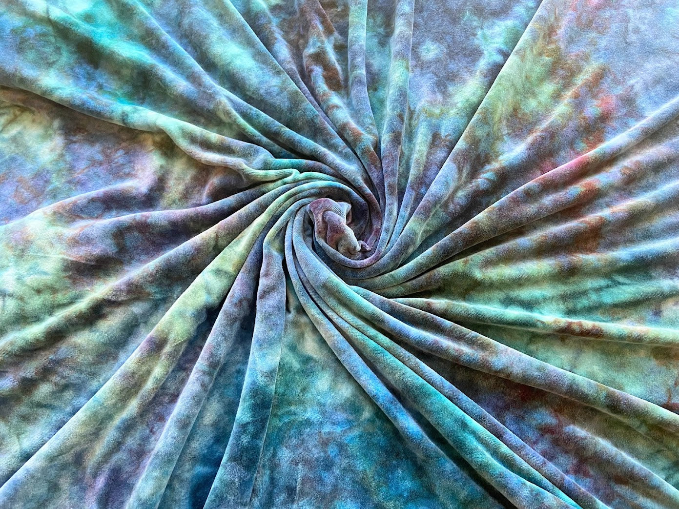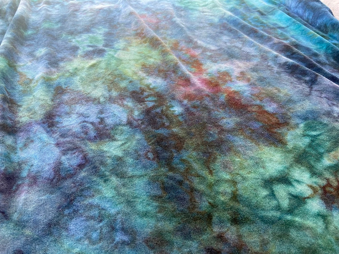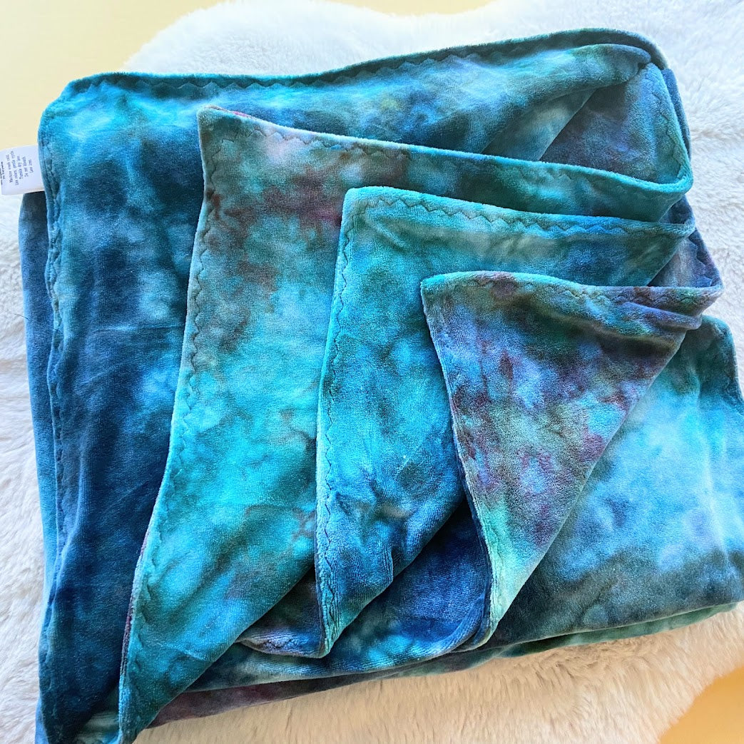 Entire blanket handmade in bamboo velour (70% viscose bamboo, 28% organic cotton, 2% polyester). It has been hand dyed LWI (low water immersion) style. This style of dyeing results in beautiful, random color patterns as the dyes mix and mingle into new colors, making each piece beautifully unique.