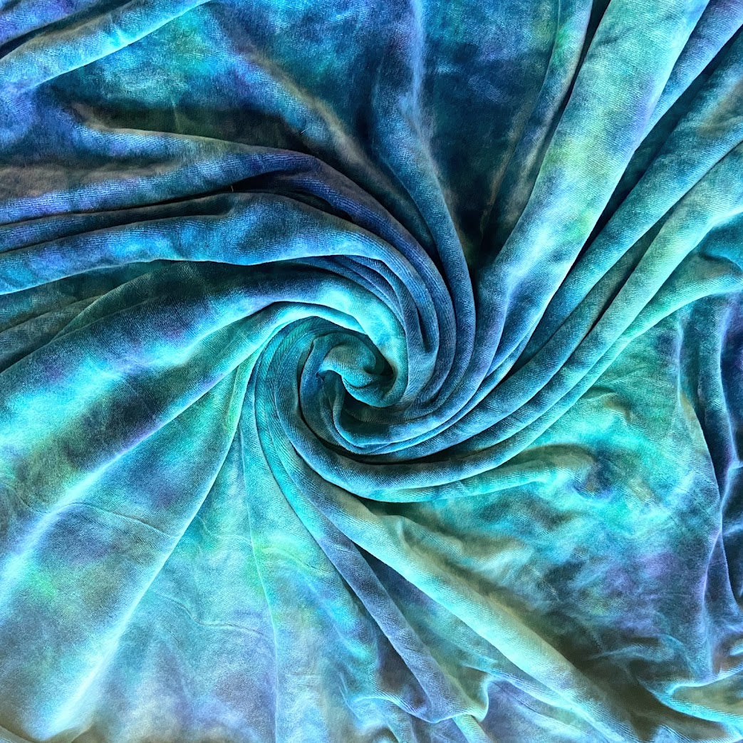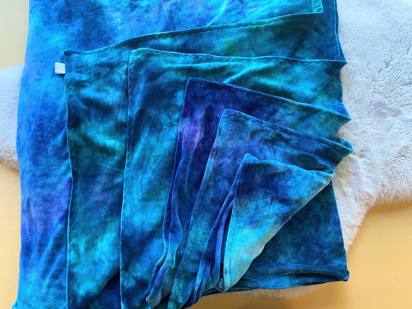 Entire blanket handmade in bamboo velour (70% viscose bamboo, 28% organic cotton, 2% polyester). It has been hand dyed LWI (low water immersion) style. This style of dyeing results in beautiful, random color patterns as the dyes mix and mingle into new colors, making each piece beautifully unique.